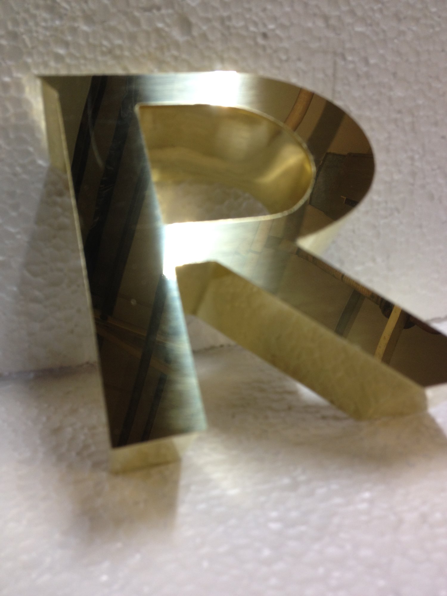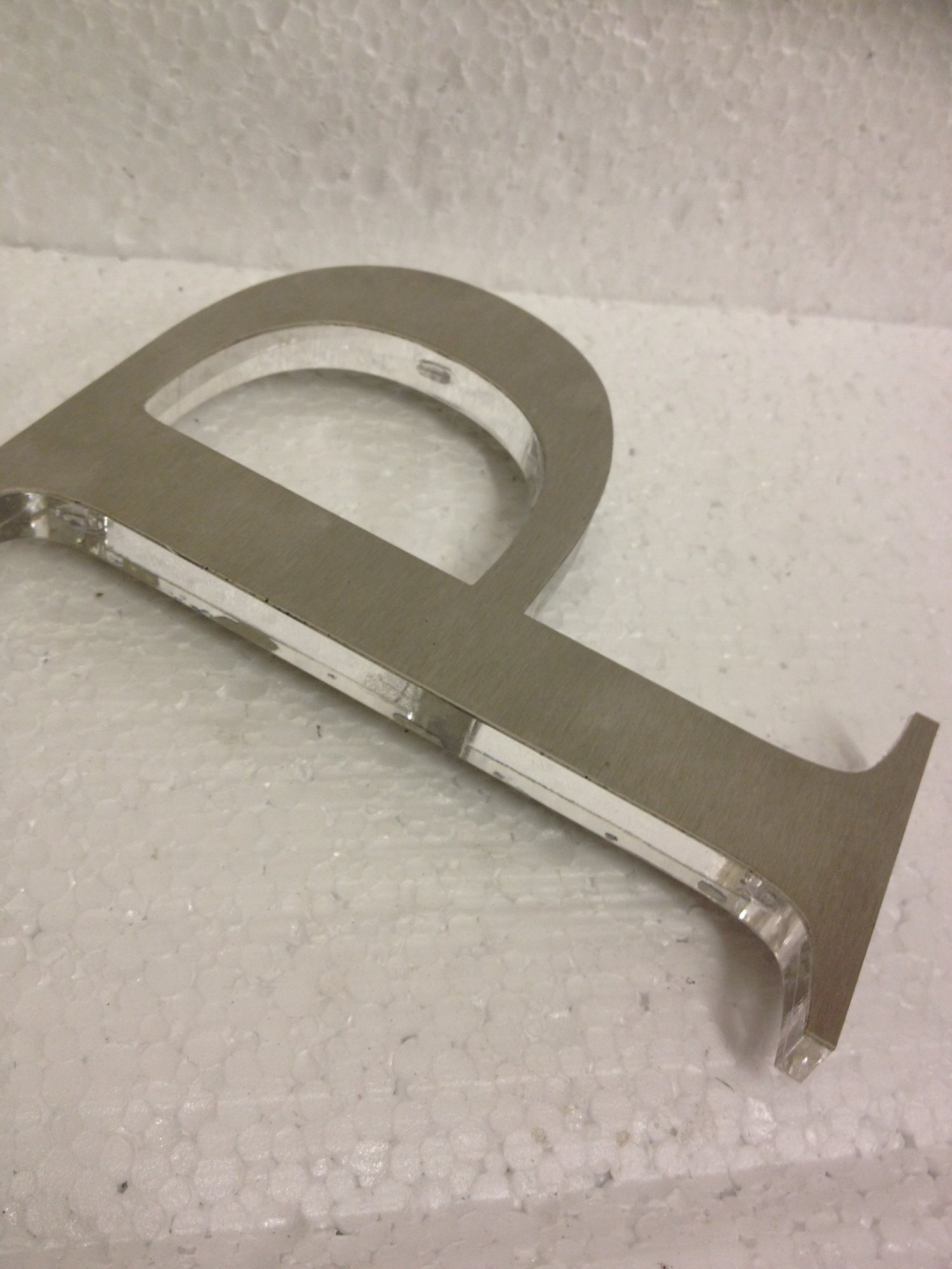 Clear acrylic flat cut letter with polished edges and brushed stainless steel face
